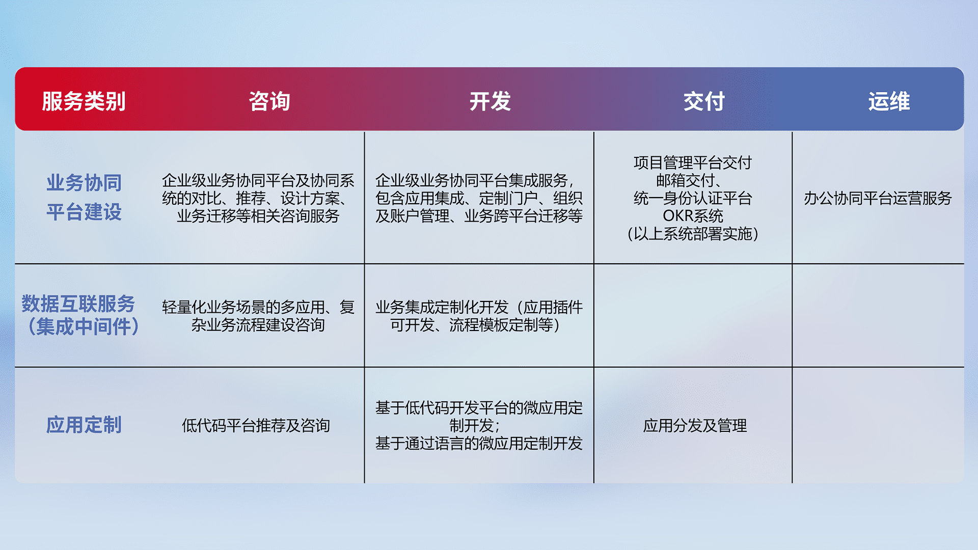 针对钉钉、、、、企微、、、、IDaas等平台级产品提供产品的规划、、、、方案、、交付、、、、定制化开发等服务,,,实现如统一协同办公、、、、智能客户服务、、混合会议管理、、、智能数据查询、、、等业务场景,,,实现数字化转型。。。
